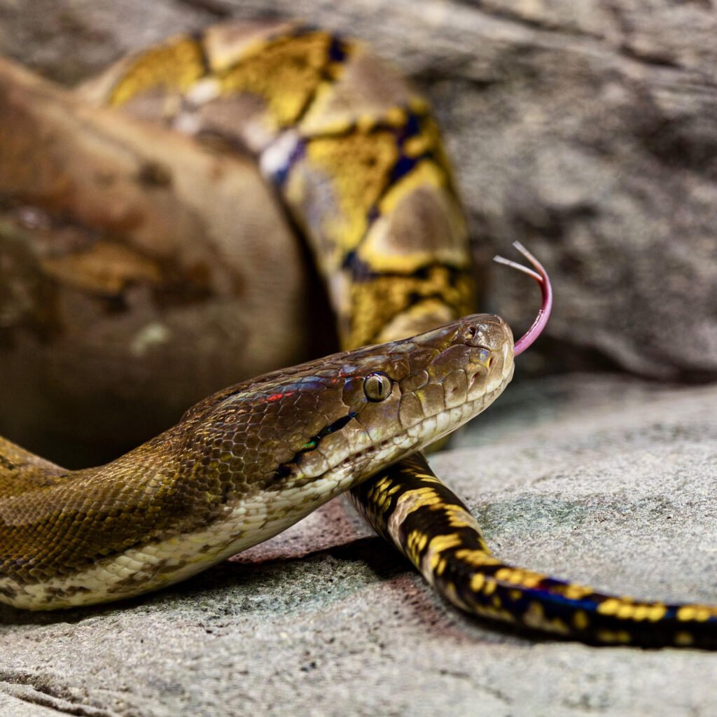 In the Reptile Realm you can be amazed by Aja the 14ft (4.2m) reticulated python with her beautiful iridescent scales. Spot the tiny day geckos opposite, and other lizards including Karma, our chameleon, as he uses his rotating eyes to hunt for insects with his long sticky tongue. Don’t miss the Invertebrate Room next door and see if you can count all of our critically endangered stick insects.