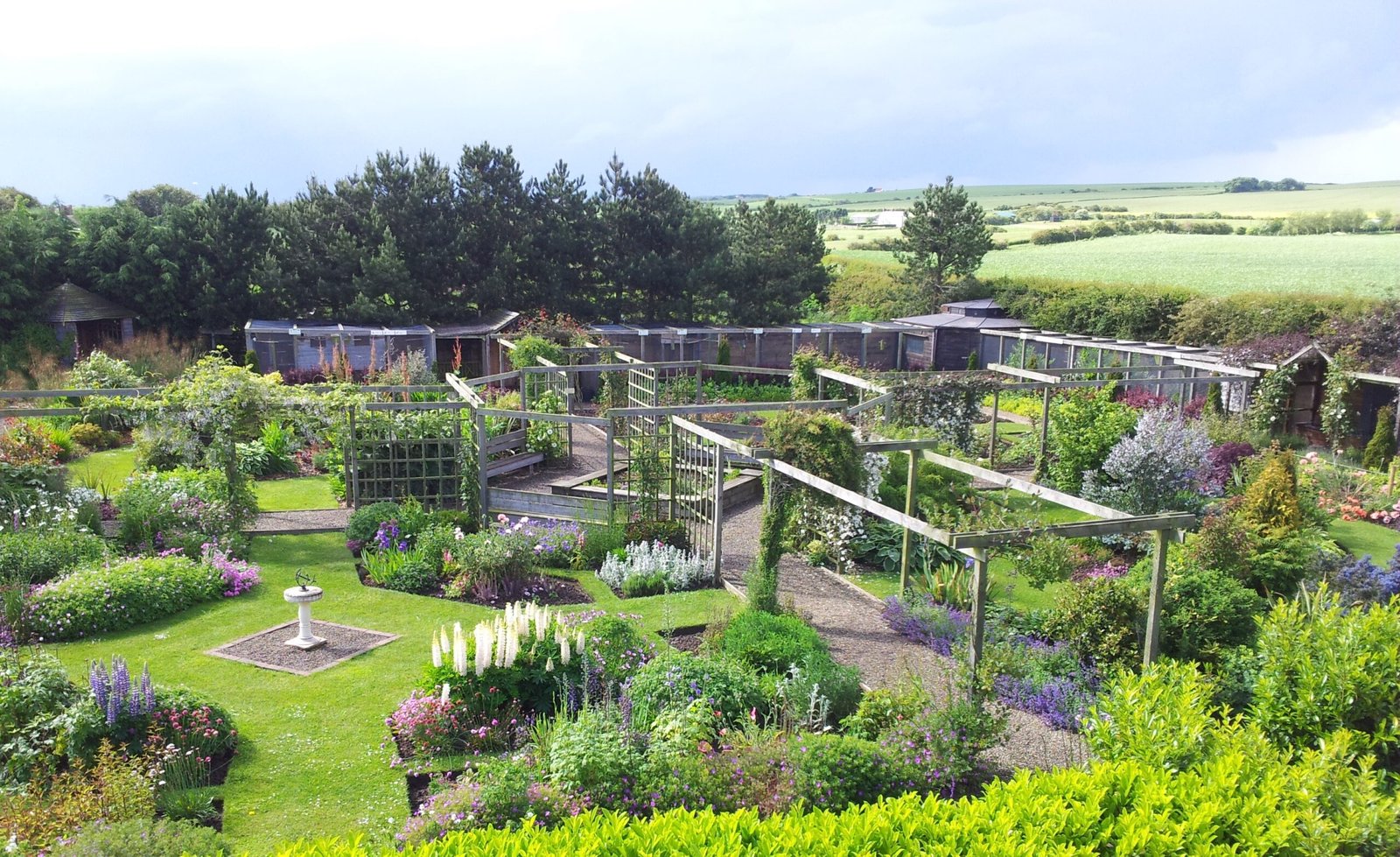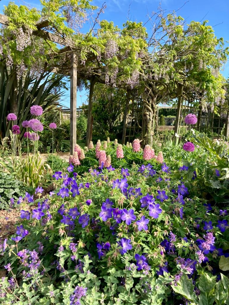 Mirroring the formal layout of the rose garden, but softened by a relaxed planting scheme full of old-fashioned favourites. Tall lupins, delphiniums and alliums rise above gentle mounds of nepeta, geraniums and lamb’s ear. Flowering throughout the summer, the colours in this garden are limited to whites, pinks, purples and blues creating a harmonious look. Bright reds, yellows and oranges are banished!