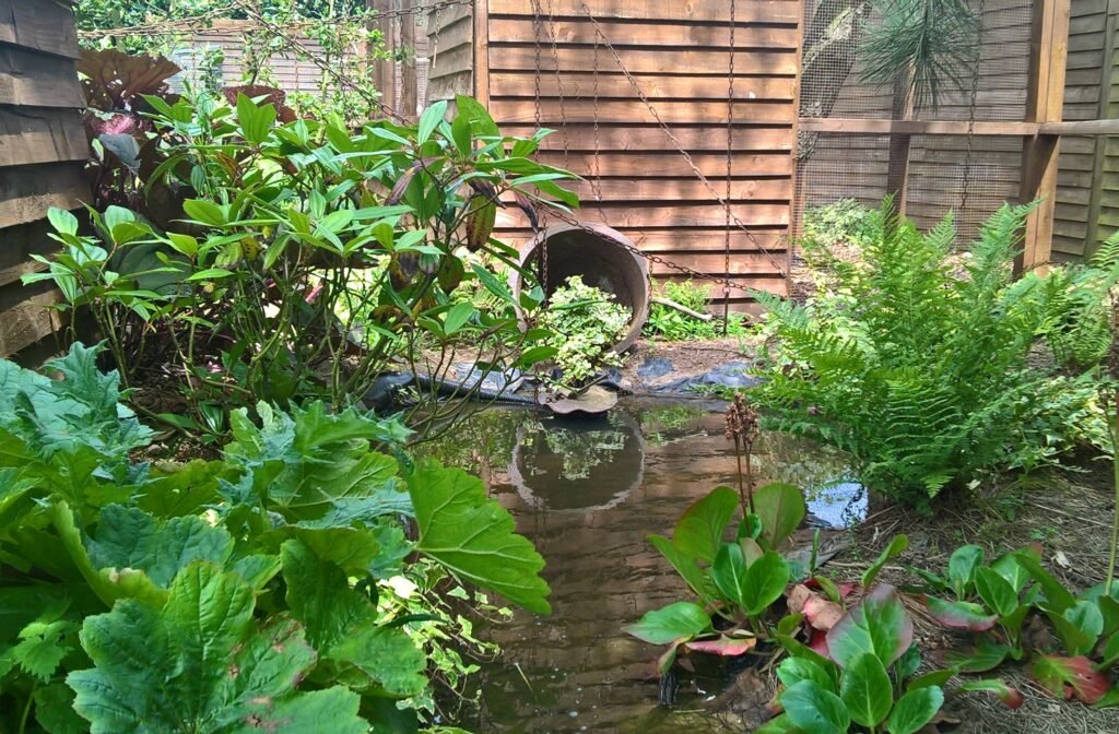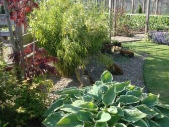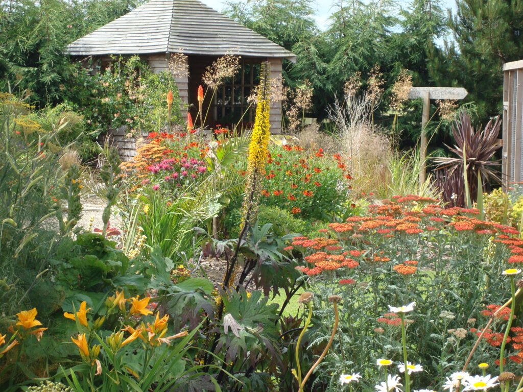 This garden uses hardy architectural plants with large, contrasting leaf shapes to create a taste of a tropical jungle on the Yorkshire coast! Plants include fatsias, cordylines, phormiums, bamboos, ferns, palms and hostas. With the addition of a few tender plants the tropical feel is intensified by selecting flowering plants in yellows, oranges, reds and hot pinks and the use of bark mulch and rotting logs. The tropical garden blends into the adjacent grass garden with its wooden gazebo, with views back across them both.
