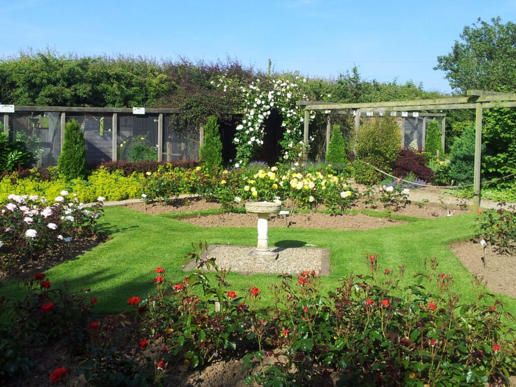 Repeating the design of the overall formal garden splits the rose garden into quarters, which are further divided and planted with over 150 roses in 14 different varieties. Four colours – red, orange yellow and pink – were chosen for the quarters, and by choosing flowers with hints of the other colours, the roses were arranged so they blended through from one bed to the next. Climbing roses in matching colours were planted on the arches over the paths and nearby arbour to create a beautiful and fragrant corner.